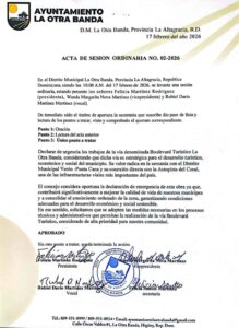 La Altagracia.- El Concejo de Regidores del Distrito Municipal La Otra Banda, en la provincia La Altagracia, aprobó y declaró de carácter urgente la construcción del Boulevard Turístico La Otra Banda, al considerar que se trata de una obra clave para el desarrollo y crecimiento de la demarcación y de toda la provincia.