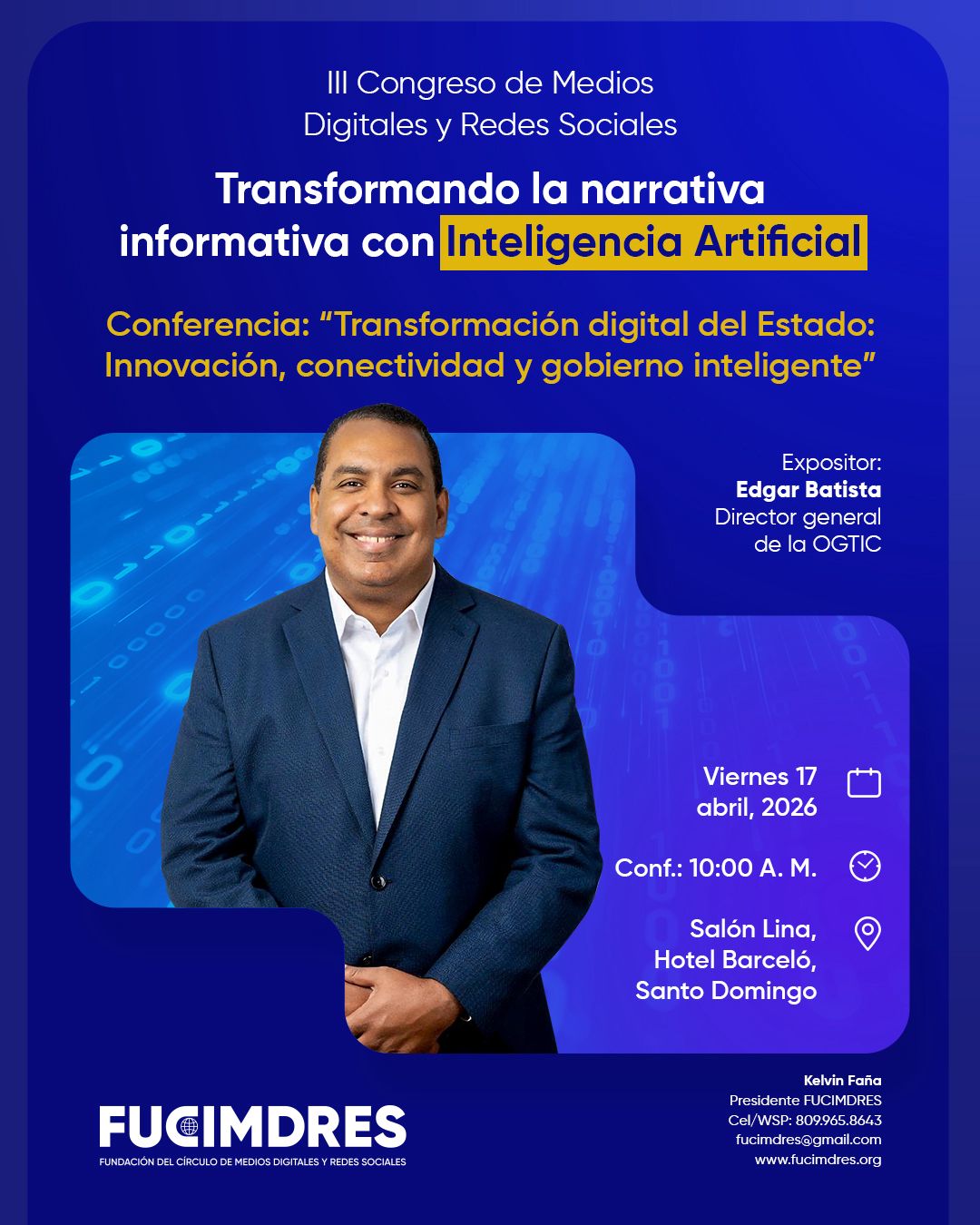Su intervención, titulada “Transformación Digital del Estado: innovación, conectividad y gobierno inteligente”, fue presentada en el marco del 3er Congreso de Medios Digitales y Redes Sociales, organizado por la Fundación del Círculo de Medios Digitales y Redes Sociales (FUCIMDRES).